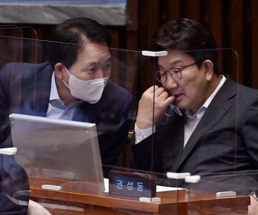 고민 깊어지는 현 원내대표 권성동 국민의힘 원내대표(오른쪽)가 2일 국회 본회의장에서 성일종 정책위의장과 대화하고 있다. 국회사진기자단 |