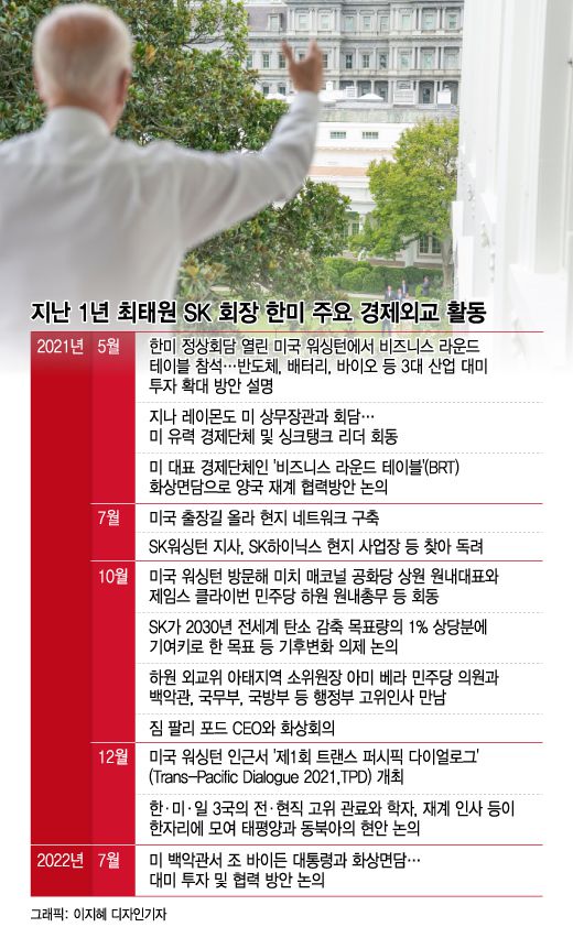지난해 5월 한미 정상회담 순방길에 주요 기업인 자격으로 동행했던 최 회장은 당시 워싱턴에서 개최된 한미 비즈니스라운드테이블에 참석해 반도체와 배터리, 바이오 등 3대 사업 대미투자를 확대했다. 당시 최 회장은 미국 대표 경제단체인 '비즈니스 라운드 테이블'(BRT)의 조슈아 볼튼 회장을 만난 자리에서 "급변하는 국제정세로 불확실성이 증대되고 기후변화와 소득격차, 인구감소 등 우리가 직면한 문제해결을 위해서는 이해관계자 자본주의와 ESG(환경·사회·지배구조) 경영을 정착하는 것이 중요하다"고 강조했다.