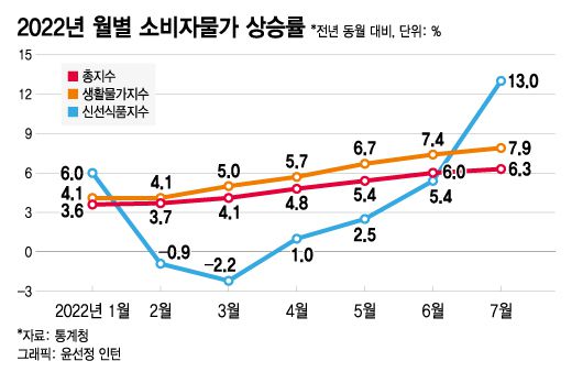 7월 소비자물가가 전년동월 대비 6.3% 오르며 외환위기 이후 처음으로 두달 연속 6%대 상승세를 이어갔다. 채소 등 농축수산물과 전기·가스·수도 요금의 오름세가 커진 때문이다. 다만 석유류 물가가 전월대비 소폭 하락하는 등 상승세가 둔화되며 소비자물가 상승폭이 축소되는 모습을 보였다.