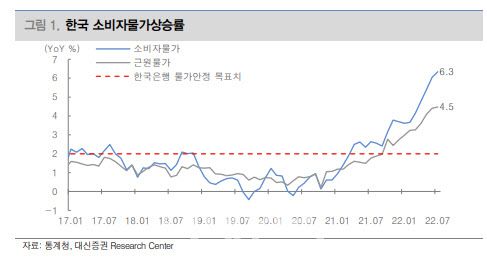 앞서 7월 국내 소비자물가 상승률은 6.3%로 시장 예상치 수준을 기록했지만 1998년 11월 이후 가장 높은 오름세를 보였다. 7월 근원 소비자물가(CPI) 상승률도 4.5%로 상승 압력을 지속했다.