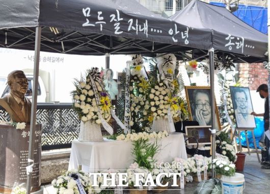 송해의 유족들이 고인의 생전 유지를 받들어 ㈔대한민국방송코미디언협회에 1억원의 발전기금을 기부했다. 사진은 서울 종로구 낙원동 송해길에 만들어져 49재까지 시민들의 발길이 이어졌던 추모 빈소 장면. /강일홍 기자 |