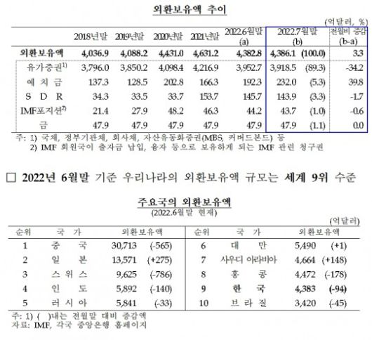 3일 한국은행(총재 이창용)이 발표한 '2022년 7월말 외환보유액'에 따르면, 7월 말 한국 외환보유액은 4386억1000만 달러로 전월말 대비 3억3000만 달러 증가했다.