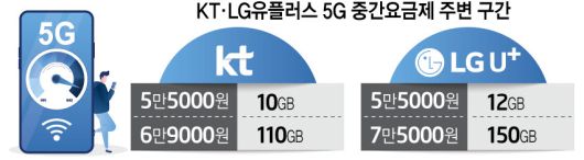 KT와 LG유플러스가 데이터 제공량 30GB 이상 5세대(5G) 이동통신 중간요금제를 내놓는다. 이보다 앞서 요금제를 내놓은 SK텔레콤과 차별화한 요금제와 데이터 양을 제시한다.