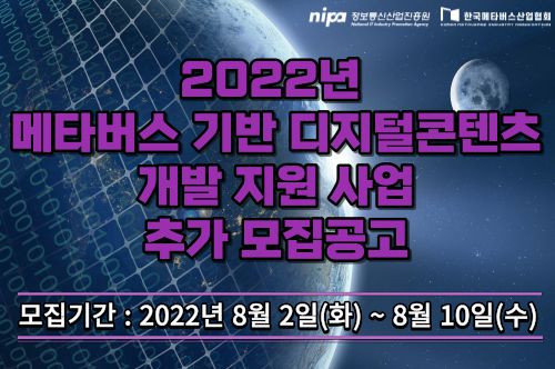 메타버스에 기반한 디지털콘텐츠를 개발하는 기업들에게 최대 3000만원이 지원된다. 한국메타버스산업협회와 정보통신산업진흥원은 3일 '2022년 메타버스 기반 디지털콘텐츠 개발 지원사업' 추가모집 공고를 통해 이 같이 밝혔다.