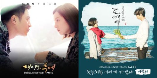‘태양의 후예’ (왼쪽)와 ‘도깨비’ OST 이미지 .사진 모스트콘텐츠ㆍ뮤직앤뉴, 스톤뮤직엔터테인먼트ㆍ화앤담픽쳐스 |