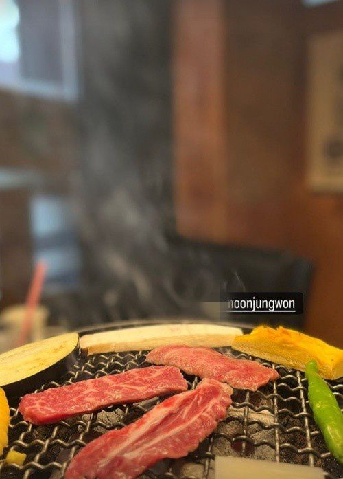 박지연은 19일 자신의 SNS에 사진을 한 장 게재했다. 해당 사진 속에는 화로에 먹음직스럽게 구워지고 있는 고기의 모습이 있는 가운데 박지연은 문정원을 태그, 그와 함께했다는 사실을 알렸다.