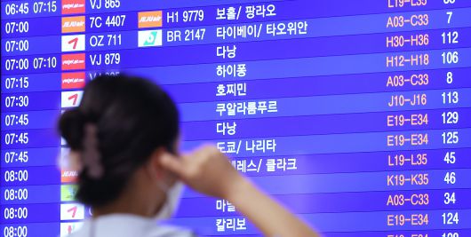 8월 4일 오전 인천국제공항 제1여객터미널 출국장에서 탑승객이 운항 스케줄 안내스크린 앞을 지나고 있다./연합뉴스 |