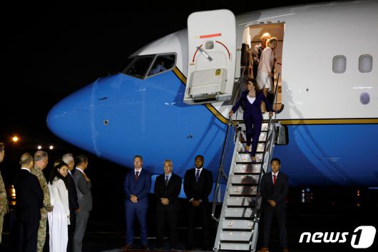 낸시 펠로시 미국 하원의장이 4일 오후 일본 도쿄 후사 요코타 미 공군기지에서 람 이매뉴얼 주일 미국대사의 환영을 받고 있다. ⓒ 로이터=뉴스1 ⓒ News1 신웅수 기자 |