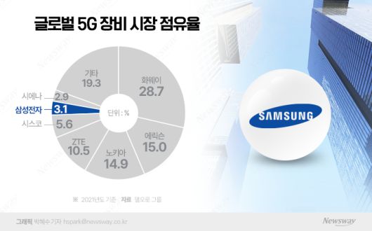 5G 기준 점유율은 더욱 부진했다. 시장조사업체 델오로가 집계한 삼성전자의 2021년 5G 장비 시장 점유율은 3.1%에 불과했다. 글로벌 통신장비 시장 3강 체제인 화웨이(28.7%), 에릭슨(15.0%), 노키아(14.9%)를 비롯해 중국 ZTE(10.5%), 미국 시스코(5.6%)에 이어 6위에 그쳤다. 기대를 모았던 화웨이 점유율도 흡수하지 못한 것이다.