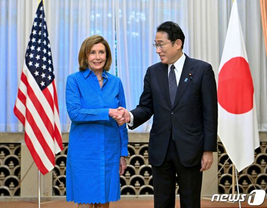 낸시 펠로시 미국 하원의장이 5일 (현지시간) 아시아 마지막 순방국인 일본에 도착해 도쿄 총리 관저에서 기시다 후미오 총리와 조찬 회동에 앞서 악수를 하고 있다. ⓒ 로이터=뉴스1 ⓒ News1 우동명 기자 |