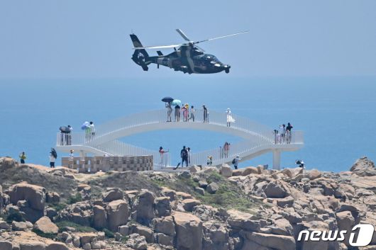 4일(현지시간)중국 핑탄섬에서 중국군 헬기가 지나가는 모습을 관광객들이 바라보고 있다. 핑탄섬은 중국 본토 중 대만과 인접한 지역 중 하나다. ⓒ AFP=뉴스1 ⓒ News1 김예원 기자 |