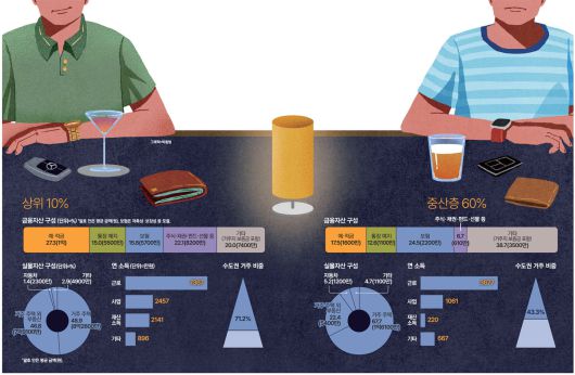 두 그룹의 보유 자산에서 가장 차이가 나는 항목은 부동산이었고, 특히 '거주주택 이외 부동산'에서 현격한 차이가 났다. 부동산 자산규모 평균은 상위 10%가 16억1700만원, 중산층 가구는 2억1500만원이었다. 이 중 거주주택 외 부동산 규모는 상위 가구 7억9100만원, 중산층 5400만원으로 차이가 훨씬 컸다. 상위 10%의 경우 실물자산 중 거주주택 외 부동산이 차지하는 비중은 46.8%로, 거주주택 비중(48.9%)과 비슷했다. 반면 중산층 가구는 실물자산 중 거주주택 비중이 67.7%였고 거주주택 외 부동산 비중은 22.4% 수준이었다.