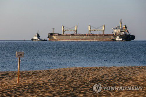 5일(현지시간) 우크라이나 초르노모르스크항에서 우크라이나산 곡물을 실은 선박이 영국을 향해 출항하고 있다. |