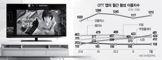 ◇'안나' ‘손흥민’ 쿠팡플레이도 상승세=넷플릭스가 다시 1위 자리를 굳혔지만 다른 OTT의 상승세도 만만치 않다. 쿠팡플레이는 오리지널 드라마 ‘안나’와 손흥민 선수의 토트넘 구단 친선 경기 단독 생중계 영향으로 전월 대비 MAU를 108만명 늘리며 7월에 481만명을 기록했다. 다만 안나가 6부작 드라마로 일찍 끝났고 토트넘 초청에 100억원 넘는 돈을 투자한 것으로 알려진 만큼 지속적 상승세를 이어갈지는 미지수다.