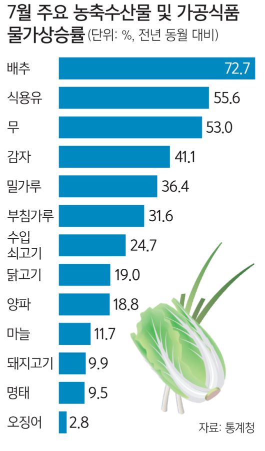 식품 물가도 전반적으로 오름세를 보이고 있다. 통계청에 따르면 지난달 식료품 및 비주류 음료의 물가지수는 1년 전보다 8.0% 상승해 지난해 2월 이후 가장 큰 폭으로 올랐다. 품목별로 보면 식용유 가격이 1년 전보다 55.6% 올랐고, 밀가루 가격과 부침가루 가격도 각각 36.4%, 31.6% 올랐다. 그 외 국수(32.9%), 라면(9.4%), 빵(12.6%), 햄·베이컨(8.0%) 등 가공식품류도 고공행진하고 있다.