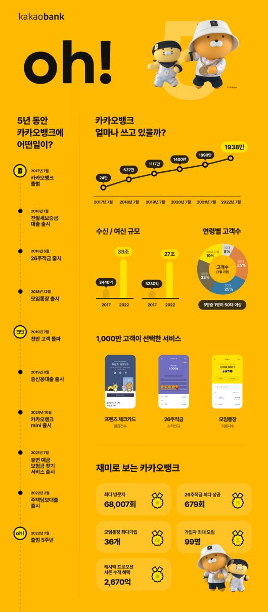 출범 5주년을 맞은 카카오뱅크가 2000만 고객 돌파를 눈앞에 두고 있다. △26주적금 △모임통장 △mini △주택담보대출 등 기존 상품과 서비스를 고객 관점에서 새롭게 재해석한 서비스가 성장에 기여했다.