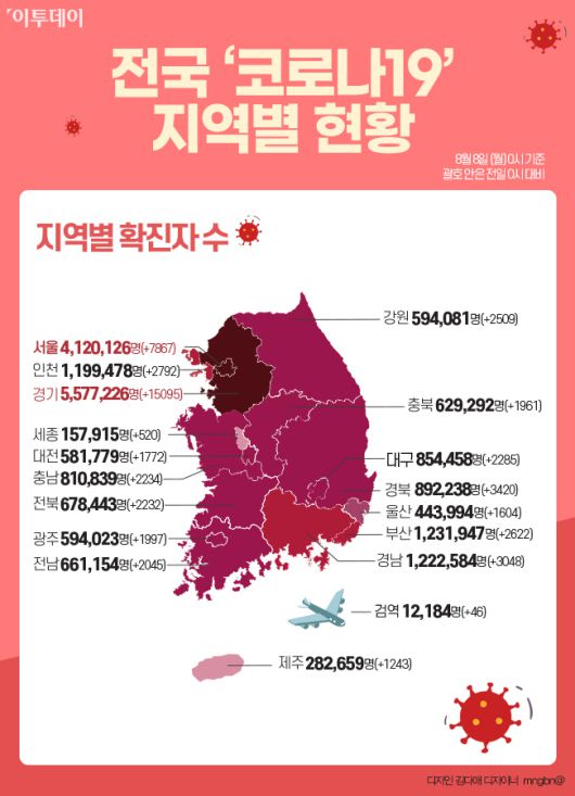 신규 확진자 5만5292명 중 7867명은 서울에서 발생했으며, 부산 2622명, 대구 2285명, 인천 2792명, 광주 1997명, 대전 1772명, 울산 1604명, 세종 520명, 경기 1만5095명, 강원 2509명, 충북 1961명, 충남 2234명, 전북 2232명, 전남 2045명, 경북 3420명, 경남 3048명, 제주에서 1243명이 각각 확진됐다. 확진자 5만5292명 중 지역발생 확진자는 5만4810명으로 집계됐다. 검역소 확진자도 46명이 추가됐다.