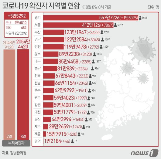 (서울=뉴스1) 김초희 디자이너 = 8일 질병관리청 중앙방역대책본부에 따르면 이날 0시 기준 국내 코로나19 누적 확진자는 5만5292명 증가한 2054만4420명으로 나타났다. 신규 확진자 5만5292명(해외유입 482명 포함)의 신고 지역은 서울 7867명(해외 14명), 경기 1만5095명(해외 30명), 인천 2792명(해외 120명), 부산 2622명(해외 9명), 대구 2285명(해외 10명), 광주 1997명(해외 27명), 대전 1772명(해외 14명), 울산 1604명(해외 11명), 세종 520명(해외 12명), 강원 2509명(해외 18명), 충북 1961명(해외 33명), 충남 2234명(해외 12명), 전북 2232명(해외 26명), 전남 2045명(해외 6명), 경북 3420명(해외 48명), 경남 3048명(해외 3명), 제주 1243명(해외 14명), 검역 과정 46명이다.