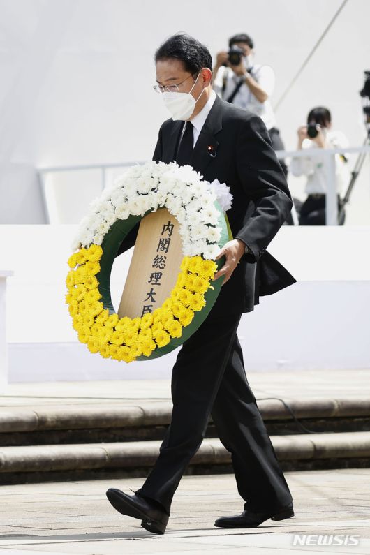 [나가사키=AP/뉴시스]9일 기시다 후미오 일본 총리가 나가사키 평화공원에서 열린 나가사키 원폭희생자 위령 평화기념식에 참석해 헌화를 위해 걸어가고 있다. 2022.08.09. |