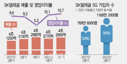 2분기 말 기준으로 5G 가입자 1168만명을 기록, 이동전화 기준 가입자 절반을 5G로 채우는 데 성공했다. 5G 가입자 증가로 2분기 가입자당평균매출(ARPU)은 3만 656원을 기록해 전년 동기 대비 0.7% 늘고 마케팅비는 7580억 원으로 5.8% 줄며 수익성을 높였다.
