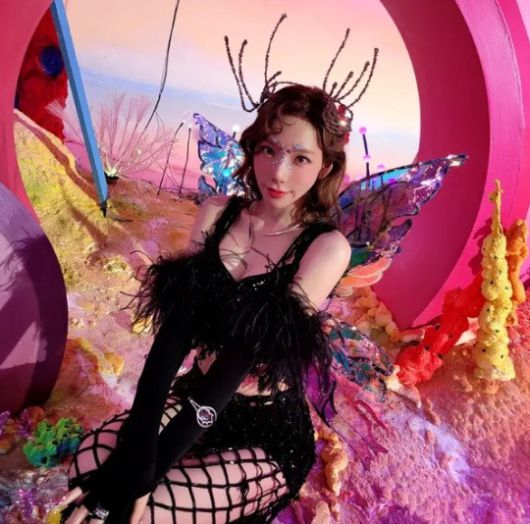 사진 속 태연은 화려한 블랙 의상으로 그리스 여신 같은 자태를 드러낸다. 태연은 브라톱을 입고 잘록한 허리 라인으로 개미허리를 자랑하고 있다.
