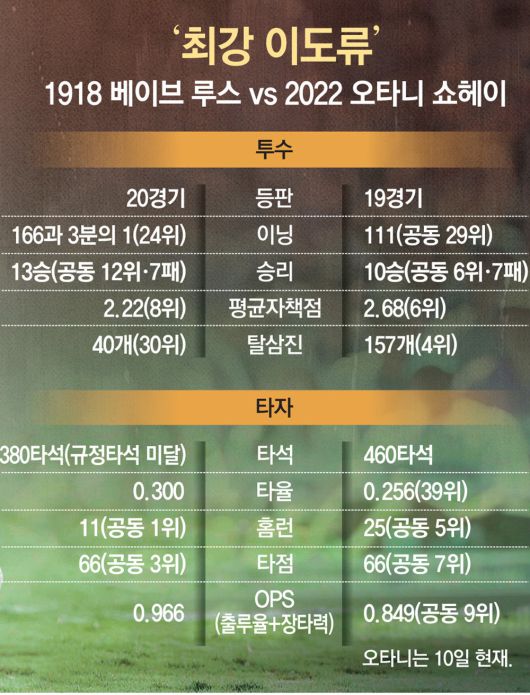 일본프로야구 니혼햄 시절까지 거슬러 올라가면 오타니가 10승-10홈런 클럽에 가입한 건 이번이 세 번째다. 오타니는 2014년 11승-10홈런으로 일본프로야구 역사상 처음으로 10승-10홈런 클럽을 개설한 뒤 2016년에는 10승-22홈런을 기록했다. MLB에서 10승-10홈런 클럽 회원은 1918년 베이브 루스(1895∼1948)에 이어 오타니가 두 번째이고 10승-20홈런 클럽은 오타니가 처음이다. 루스는 당시 보스턴에서 13승 11홈런을 기록했다.