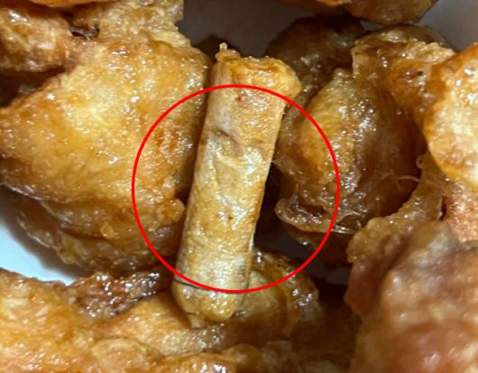 프렌차이즈 장모님치킨의 한 가맹 매장에서 배달한 치킨에서 담배 꽁초가 튀겨진 채 들어가 있다 (사진=SNS) |