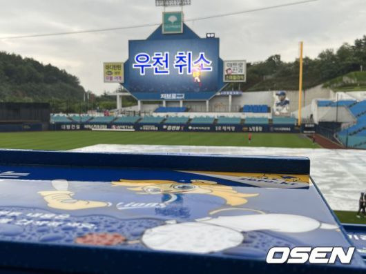 이날 대구지역은 오전부터 비가 내리고 있다. 오후 내내 비 예보가 내려져 있어 경기 개시가 불투명해보였다. 대구삼성라이온즈파크 그라운드는 전날 밤에 미리 방수포를 덮여 놨다.