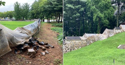 추가로 확인된 피해 사례를 보면 지난해 보물로 지정된 경기 안성 객사 정청은 이번 비로 담장 일부가 무너져 비를 막기 위한 임시 천막을 설치했다.