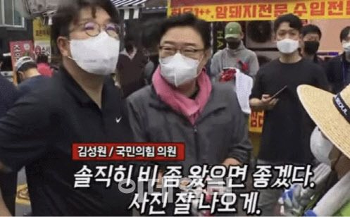 김성원(가운데) 국민의힘 의원이 11일 서울 동작구 수해복구 현장에서 “사진이 잘 나오게 비가 더 왔으면 좋겠다”고 실언을 해 논란이 일었다. (사진=채널A 갈무리) |