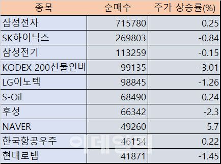 이어 △LG이노텍(011070)(988억원) △S-Oil(684억원) △후성(093370)(663억원) △NAVER(035420)(492억원) △한국항공우주(047810)(461억원) △현대로템(064350)(418억원) 순이었다. 삼성전자 우선주는 제외했다.