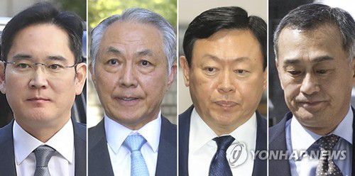 (왼쪽부터) 이재용 삼성전자 부회장 - 강덕수 전 STX그룹 회장 - 신동빈 롯데그룹 회장 - 장세주 동국제강 회장 |