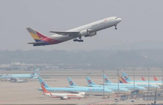 [인천공항=뉴시스] 조수정 기자 = 아시아나항공이 1분기 기준 최대 실적을 경신했다. 1분기 화물 사업 매출이 8843억원으로 전년동기대비 45% 늘어난 덕분이 컸다. 대한항공도 올해 1분기 7884억원의 영업이익과 2조 8052억원 매출을 기록, 전년 동기 대비 533%, 60% 증가했다. 이는 2조 1486억원의 화물 노선 실적 덕분이다. 사진은 17일 오후 인천국제공항 아시아나항공 화물기가 이륙 준비하는 모습. 2022.05.17. |