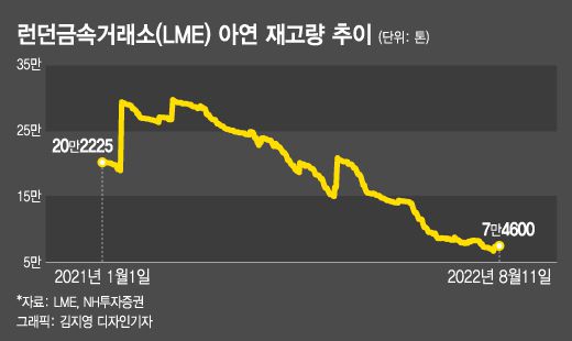 최진영 이베스트투자증권 연구원은 "러시아 천연가스 공급 차질로 빚어진 유럽의 전력난은 글로벌 아연 생산비중의 20%를 차지하는 유럽계 제련기업들의 아연 생산 감산을 가져왔다"며 "니르스타(Nyrstar), 볼리덴(Boliden) 등의 아연 감산까지 연장됨에 따라 유럽 아연 생산량은 월평균 20만5000톤에서 18만톤으로 내려왔다"고 분석했다.