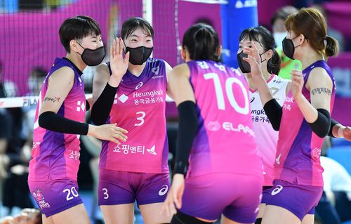 득점 후 기뻐하는 흥국생명 선수들 |