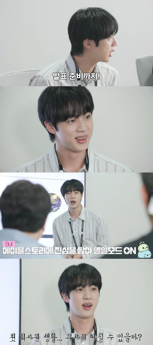 진은 똘망똘망한 눈빛과 정확한 딕션, 자신감 넘치는 목소리로 열혈 신입사원의 모습을 보여주다 장난스러운 표정으로 “퇴사하겠습니다”라고 말해 주변을 웃음바다로 만들었다.