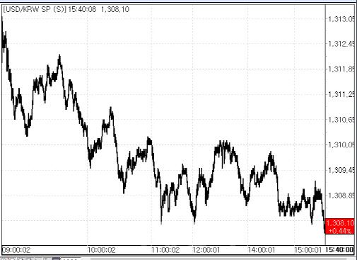 16일 서울외국환중개에 따르면 이날 환율은 전 거래일 종가(1302.4원) 대비 5.7원 오른 1308.1원에 상승 마감했다. 3거래일만의 상승 전환이다. 이날 환율은 역외 환율 급등을 따라 전일 대비 9.6원 오른 1312.0원에 시작한 뒤 9~10원 안팎의 상승폭을 기록하다가 오후로 갈수록 점차 상승폭을 줄여나갔다. 1310원대에서 수출업체 네고 등의 영향이 커지면서 1300원대서 마감했다.