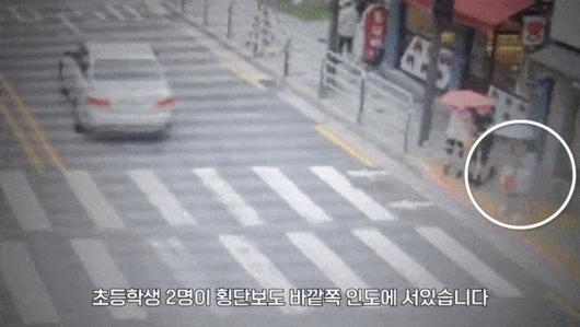 영상을 보면 지난달 16일 서울 강북구의 한 왕복 5차로에서 초등학생 2명이 횡단보도를 건너기 위해 기다리다가 신호등이 보행자 신호로 바뀌자 길을 건넌다.