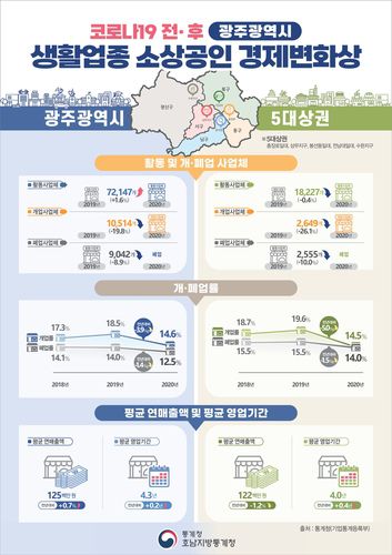 호남지방통계청이 17일 발표한 코로나19 전후 광주시 생활업종 소상공인 경제변화상 보고서에 따르면 2020년 개업 사업체는 1만514개, 폐업 사업체는 9천42개로 코로나19 이전인 2019년과 비교해 각 2천593개(19.8%)와 884개(8.9%) 줄었다.