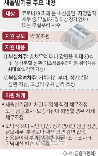또 고의적 연체를 통한 도덕적 해이를 막기 위해 2년간 채무조정 이용 사실을 공공정보로 등록하고 1∼5년간 신용평가에 반영한다. 금융위는 현재 37조∼56조원으로 추정되는 소상공인 대출 잠재부실 중 새출발기금이 50∼80% 수준을 처리할 수 있을 것으로 추산했다. 권대영 금융위 금융정책국장은 “새출발기금은 정부의 예산 30조원이 투입돼 감면분 부담 주체가 채권 금융회사가 아닌 정부인 만큼 금융권이 감내할 수 있는 부분이라고 본다”고 말했다.