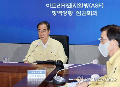 (서울=연합뉴스) 한혜원 기자 = 한덕수 국무총리는 19일 아프리카돼지열병(ASF)과 관련 "추석 연휴에 아프리카돼지열병이 확산하지 않도록 관계부처와 지자체가 귀성객의 농장 방문 자제 등을 적극적으로 홍보하라"고 밝혔다.