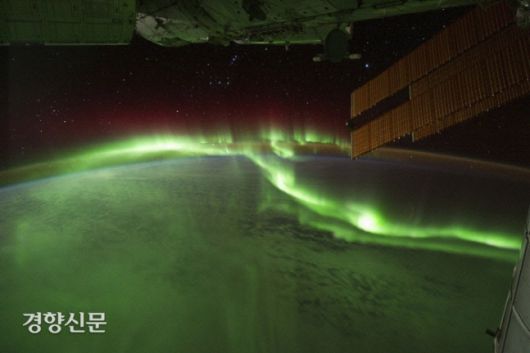 2011년 9월 17일(현지시간) 마다가스카르 남쪽에서 호주 북쪽으로 흐르는 오로라를 국제우주정거장에서 바라본 모습. 오로라는 지구 자기권에 들어온 고에너지의 양성자와 전자가 고층 대기의 입자들과 충돌한 후 충돌 전후의 에너지 차이만큼 빛을 내는 자연적인 방전현상의 일종이다. 미국 항공우주국(NASA) |