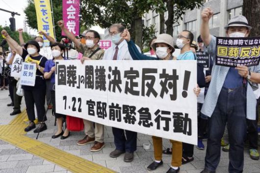 지난달 22일 일본 도쿄의 총리 관저 앞에 모인 시위대가 아베 신조 전 총리의 국장(國葬)을 치르기로 한 각의의 결정에 항의하고 있다. [이미지출처=연합뉴스] |