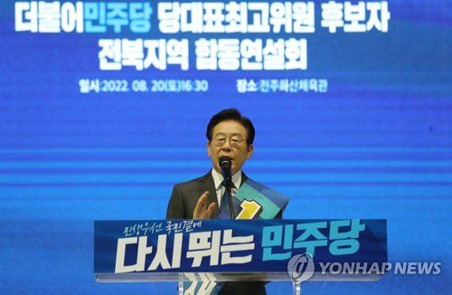 (서울·전주=연합뉴스) 김남권 정수연 기자 = 더불어민주당 당권 주자인 이재명 후보는 20일 전북 지역 경선에서도 압도적인 득표율을 기록한 것을 두고 "앞으로 남은 일정도 낮은 자세로 최선을 다하겠다"고 밝혔다.