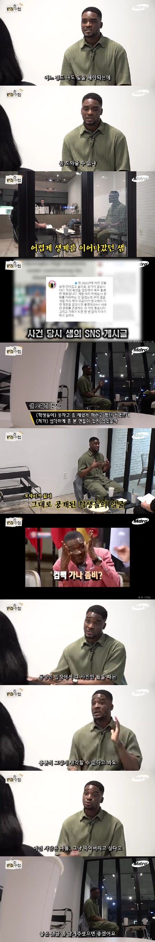 샘 오취리는 'MBC PD의 수첩'에서 나왔다'는 제작진의 말에 도망갔다. 추격전 후 그는 "'PD 수첩'인 줄 알고 집에 갈 뻔했다"라고 말하며 인터뷰에 응하기로 했다.