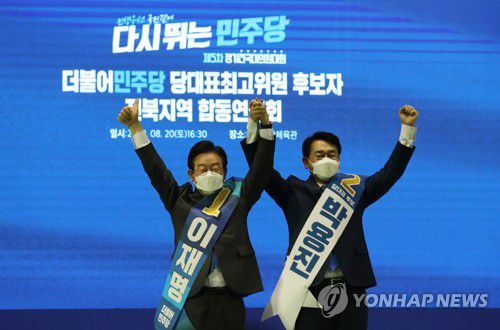 (서울·강진=연합뉴스) 고동욱 정수연 기자 = 더불어민주당 당 대표에 도전하는 이재명·박용진 후보가 21일 당의 심장부인 호남에서 '2차전'을 벌였다.