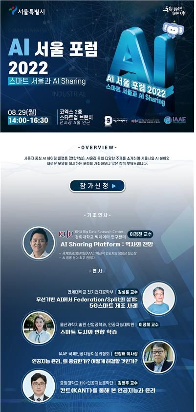 이번 포럼에서는 학계 전문가과 함께 ‘AI 쉐어링(연합학습) 기반의 스마트도시 인공지능 기술’의 동향을 살펴보고, 앞으로 시민과 인공지능이 공존하기 위해 필요한 ‘AI 윤리’에 대해 논의한다. 포럼은 서울디지털재단, 경희대학교 빅데이터 연구센터, IAAE ‘국제인공지능·윤리협회’와 공동으로 주관한다.