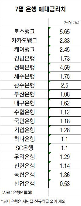 5대 시중은행(국민ㆍ신한ㆍ하나ㆍ우리ㆍ농협) 1%대 수준으로 대부분 낮았다. 그 중에서는 농협은행이 1.36%로 가장 컸다. 농협은행은 대출금리가 3.9%였고, 저축성 수신금리가 2.54%였다. 대출금리는 다른 시중은행 대비 가장 낮았지만, 수신금리 경쟁력이 떨어지면서 예대금리차가 컸다. 이어 우리은행(1.29%), KB국민은행(1.18%), 신한은행(1.14%), 하나은행(1.1%) 순이었다. 5대 시중은행 7월 평균 예대금리차는 1.21%다.
