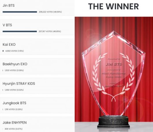 샤이닝 어워즈는 가장 잘생긴 17명의 K팝 남자 아이콘들을 후보로 선정했으며 이 중 진은 총 20만 8222표를 획득, 48.9%의 득표율로 1위를 차지했다.