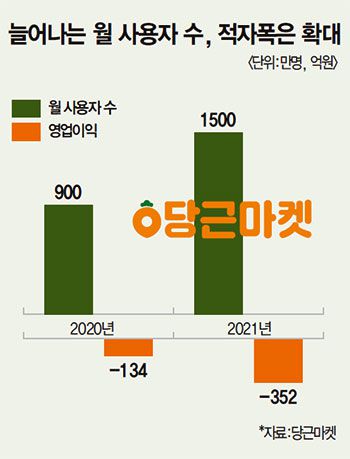 이제는 ‘국민 앱’으로 떠오른 ‘당근마켓’의 지난해 영업손실이다. 최근 회원 수 3000만명을 돌파하며 승승장구 중인 외형과 달리 적자폭은 커지는 중이다. 같은 기간 매출(257억원)도 크지 않다. 3조원에 달하는 기업가치를 감안하면 상대적으로 더 초라하게 느껴진다.